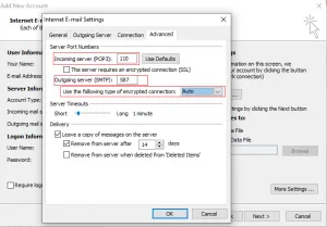 مدیریت ایمیل توسط outlook8. در همان پنجره اینبار در تب Advanced پورت ورودی و خروجی ایمیل را باید وارد کنید به صورت عادی پورت ورودی 110 و خروجی 25 است اما ممکن سرویس دهنده هاست شما پورت های خاصی را درنظر گرفته باشد که باید از سرویس دهنده خود بپرسید که شماره این پورت ها چند است برای مثال پارس وب سرور از پورت 110 برای ورودی و از 587 برای خروجی ایمیل استفاده میکند.