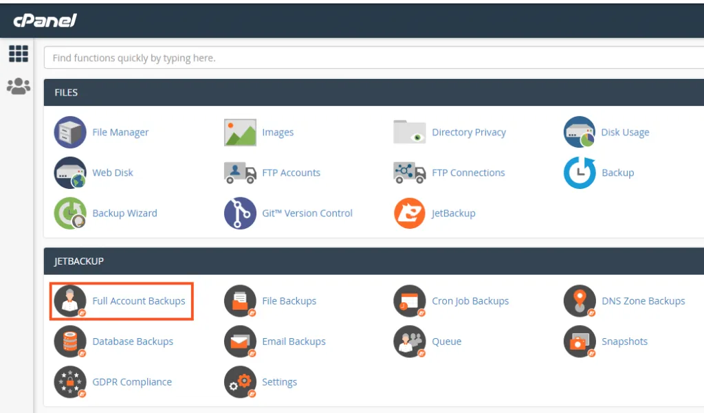 ابتدا وارد سی پنل شوید و از بخش Jetbackup بر روی Full Account Backups کلیک کنید .