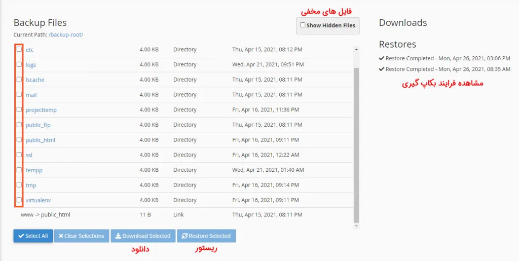 در صفحه جدیدی که باز میشود میتوانید تمام فایل ها را مشاهده کنید . برای مشاهده فایل های Hidden مانند تصویر تیک ان را بزنید. پس از اینکه پوشه ها و فایل ها را انتخاب کردید بر روی Restore selected کلیک کنید تا به تاریخ مدنظر شما بازگردانی شود . اگر میخواهید یک نسخه از این فایل ها و پوشه ها را دانلود کنید بر روی Download selected کلیک کنید تا لینک دانلود ساخته شود . در همین صفحه میتوانید روند انجام درخواست خود را مشاهده کنید.