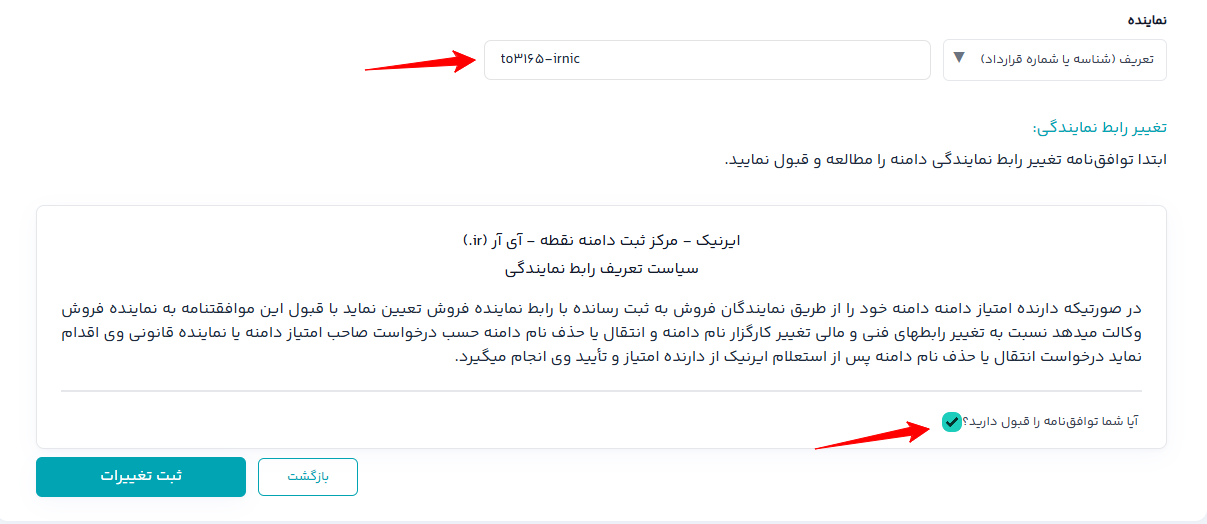 سپس در صفحه ای که باز می شود باید شناسه to3165-irnic را در قسمت نماینده به شکل زیر ست کنید و ثبت تغییرات را بزنید بعد انجام این مورد شناسه نمایش داده نمی شود و همین مورد کفایت می کند!