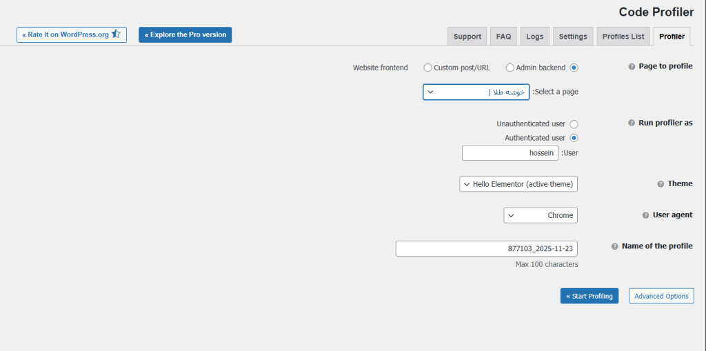 Run profiler as: این بخش مربوط به یوزری هست که با آن به پیشخوان لاگین کردید و قرار است این آنالیز را انجام دهید و نیاز به تغییر خاصی هم ندارد.