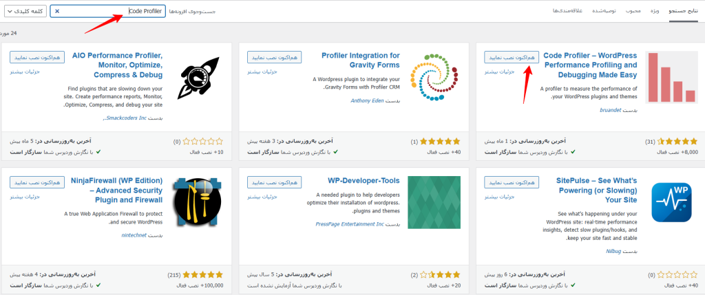 این افزونه مانند سایر افزونه های وردپرسی به سادگی از مخزن وردپرس قابل نصب می باشد! فقط کافی هست در پیشخوان وردپرس خود بر روی افزونه ها کلیک کنید و افزودن افزونه جدید را انتخاب کنید و در قسمت سرچ افزونه عبارت Code Profiler را به شکل زیر تایپ کنید.