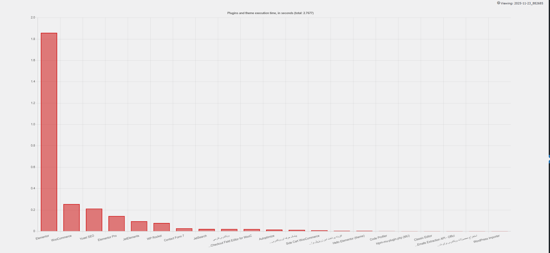 همانطور که در تصویر مشخص هست در این تست ما افزونه المنتور با با نزدیک به 1.8 ثانیه بیشترین تایم را برای لود شدن مصرف می کند و بعد آن افزونه های ووکامرس و Yoast SEO قرار دارند.