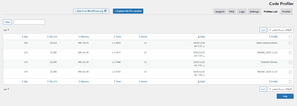 بعد از فعالسازی در نوار سمت راست وردپرس شما یک گزینه به نام Code Profiler قرار می گیرد که با کلیک بر روی آن وارد محیط افزونه می شوید.
