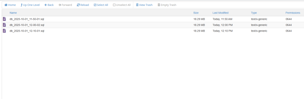 الان اگر وارد مسیر پوشه backup خود شوید لیست دیتابیس های خود را می توانید مشاهده کنید که از دیتابیس های شما بک آپ گیری شده است و سه نسخه آخر نگهداری می شود و بک آپ جدید که گرفته می شود جایگزین قدیمی ترین بک آپ می شود.