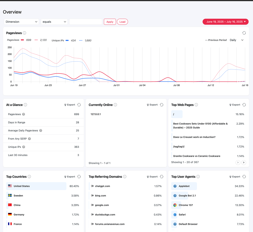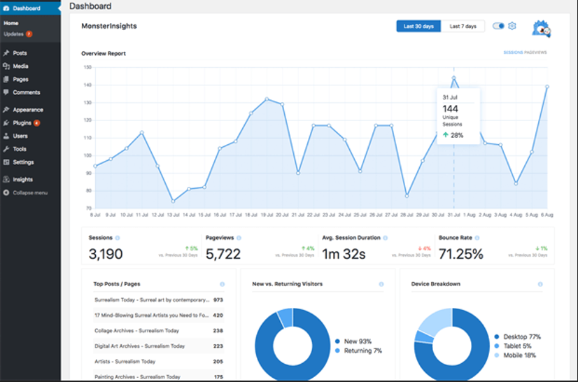 بدون نیاز به دانش کدنویسی یا ویرایش قالب افزونه نصب و فعال می‌ شود و نیازی نیست هر بار به داشبورد Google Analytics بروید و آمار اولیه، صفحات پربازدید و روند ترافیک را داخل وردپرس می‌ بینید.