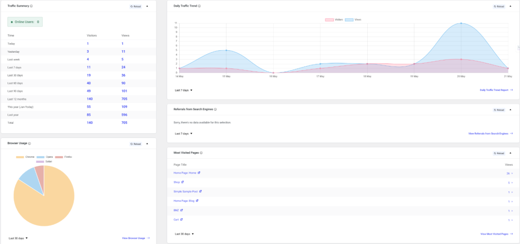 شما در این افزونه می توانید تعداد بازدید ها در بازه زمانی های مختلف مانند روزانه، هفتگی، ماهانه یا سالانه را بررسی کنید و ببینید کدام پست و صفحات بیشترین تعداد بازدید را دارند و کاربران از کجا وارد سایت شما شده اند برای مثال از لینک سایت های دیگر یا موتورهای جستجو!