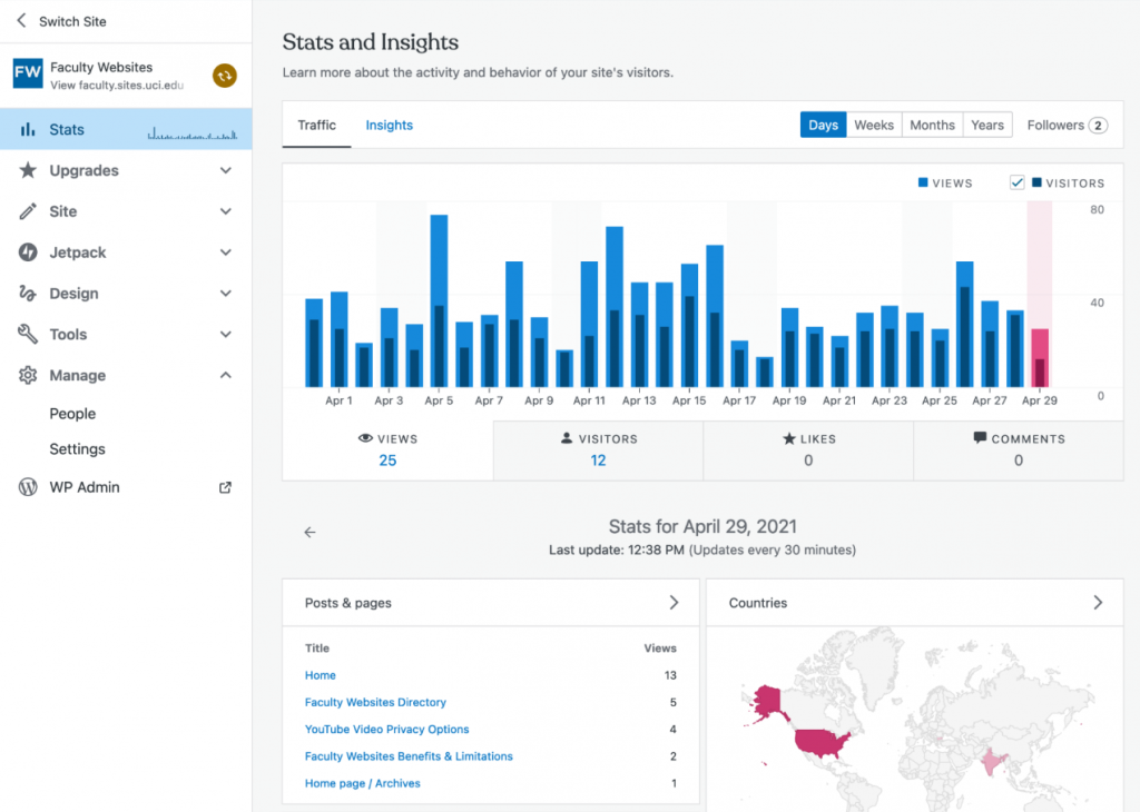 این قابلیت بخشی از ویژگی های افزونه جت پک می باشد که به شما کمک می کند آمار بازدید و ترافیک سایت را ردیابی کنید. این آمار های نیاز به فعالسازی ندارد و همان لحظه ای که این افزونه نصب می شود شروع به جمع آوری آمارها می کند.